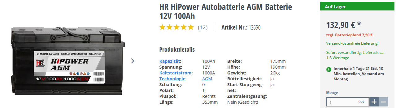 Mein Lithium-Angebot hat er auf Grund des Preises ausgeschlagen und wieder einen Satz AGM (72 V) für 600 Euro gekauft. Der Opa war damals aber schon 90 Jahre alt - konnte ich verstehen.