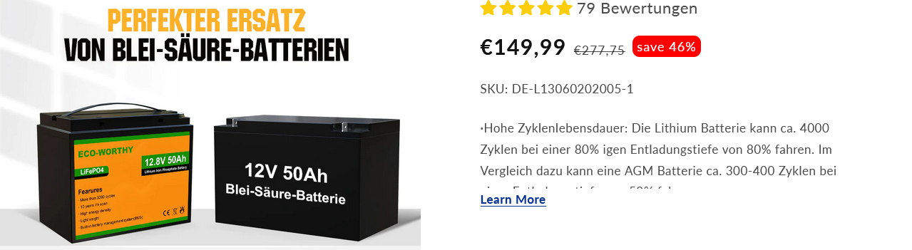 Das ist aber größtenteils nur deshalb so, weil die Lithium gepusht ist (und deswegen auch teurer). Käme sie genauso schlicht und einfach daher, wie die Bleibatterie, wäre sie nicht weit ab von dieser. Oder anders ausgedrückt, würde man der Bleibatterie, genau wie der Lithium, 50 % mehr Kapazität und ein BMS gönnen, käme sie dieser wieder näher.