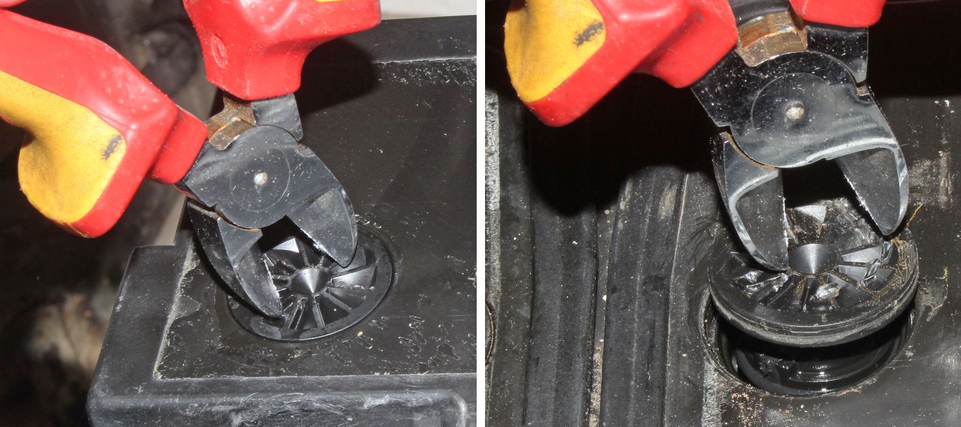 Die beiden Schenkel eines Seitenschneiders werden in jeweils eine Hand genommen, mit dem Oberkörpergewicht über die Zange gebeugt und die Spitzen in die Verschraubung gedrückt. Den Oberkörper samt Seitenschneider drehen und die Schrauben lassen sich lösen. Man muß etwas üben.