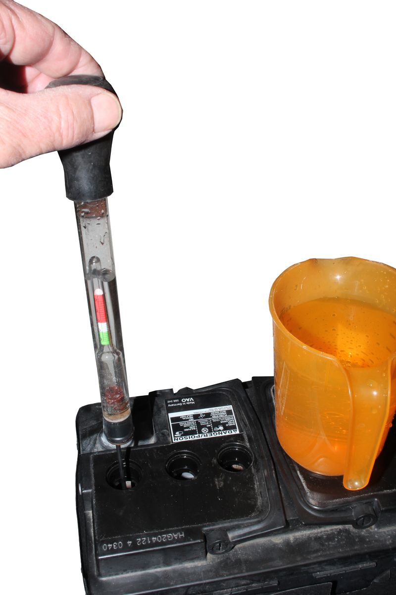 Mit einem Säureprüfer wird Batteriewasser (destilliertes oder entionisiertes Wasser) soviel nachgefüllt, bis das Vlies vollständig gesättigt ist. Ein Spiegel sollte vermieden werden, da die Säure zu sehr verdünnt werden könnte. Nun erfolgt eine Konstantspannungsladung mit 14,8 V über 2-4 Wochen. Anschließend bleibt die Batterie etwa 24 Stunden in Ruhe stehen. Schließlich wird, falls nötig, noch einmal Batteriewasser nachgespritzt. Ist Akkusäure vorhanden, kann man damit den Pegel weiter anheben, wie bei einer normalen Naßbatterie. Abschließend werden die Verschraubungen wieder angebracht, was jetzt leichter zu bewerkstelligen ist.