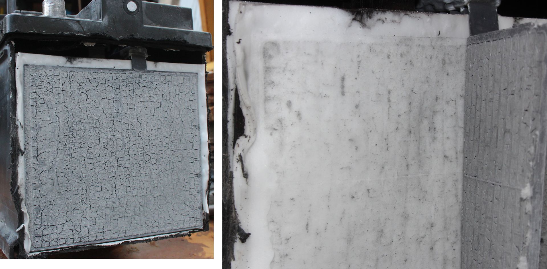 Mit dieser Prozedur wurden schon viele Batterien regeneriert. Voraussetzung ist natürlich, daß die Batterie keine anderen Schädigungen aufweist, wie Nebenschlüsse oder Gitterkorrosion. Die auf den Fotos abgebildete Batterie zeigte vor der Regenerierung im Belastungstest mit 250 A eine Spannung von 9,9 V, mit fallender Tendenz. Die Ladung erfolgte über 14 Tage mit 15 V. Der Ladestrom betrug in den ersten Tagen 0,24-0,14 A und in den letzten Tagen 0,08 A. Der Abschlußtest mit 250 A ergab stabil 10,5 V.