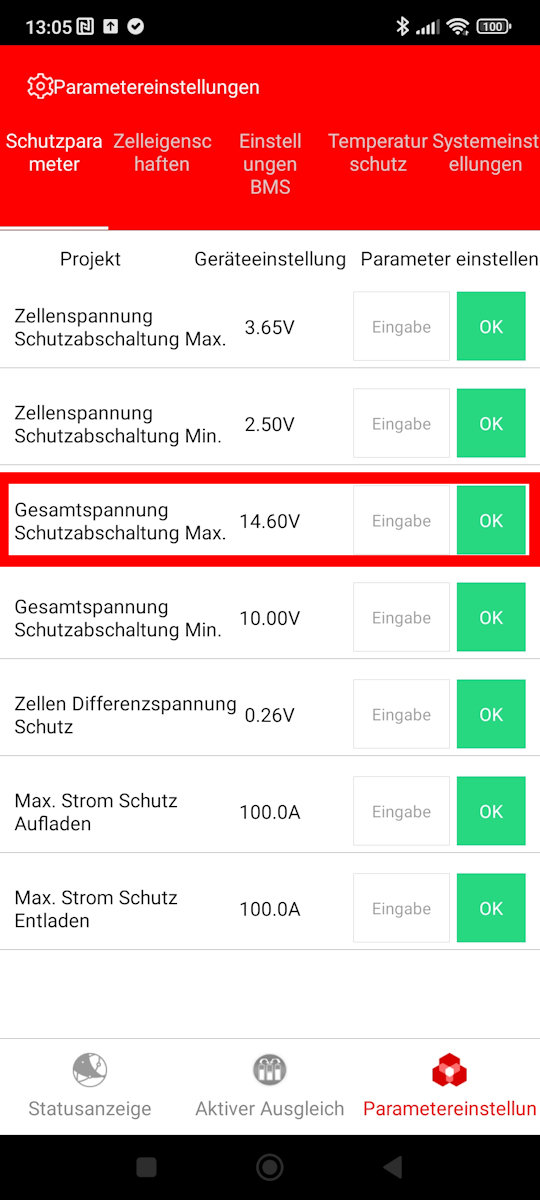 Meistens ist allerdings nicht dieser Wert derjenige, der die Ladung beendet, sondern der Wert Zellenspannung Schutzabschaltung Max., weil zumeist die Spannung der schwächsten Zelle beim Laden zuerst den eingstellten Maximalwert (hier 3,65V) erreicht und das BMS dann den Ladestromzweig abschaltet.
