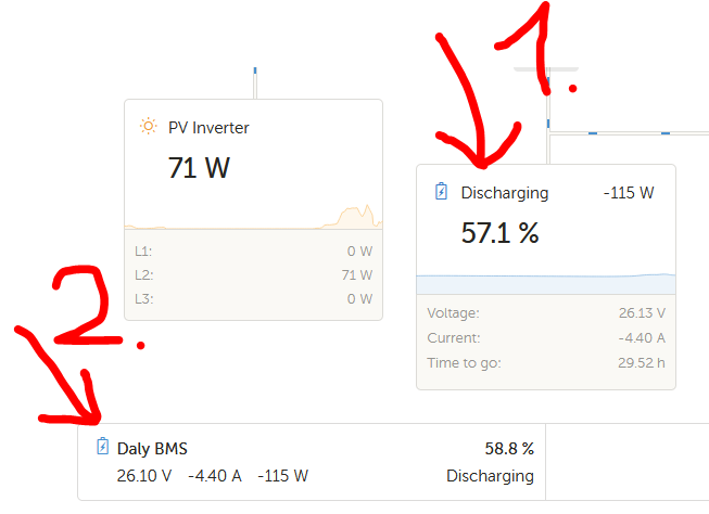Sorry, falsches Bild im Eifer des Gefechts erwischt. Hier das richtige. Das Daly rundet ab. Wenns z.B. 0.39A gezogen werden, werden 0.3A angezeigt. Der Smartshunt ist dahingehend etwas genauer. Im großen und ganzen, stimmen wie Messungen aber ungefähr überein wenn man die richtige Firmware nutzt und die Auflösung der Strommessung vom BMS anpasst.