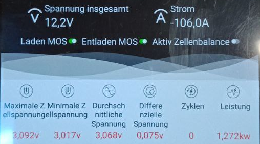 Bei einer effektiven Belastung von 1300W ist das BMS ausgestiegen (wären DC seitig bei 77% ~ 1700W - bei 12,2V => 140A)