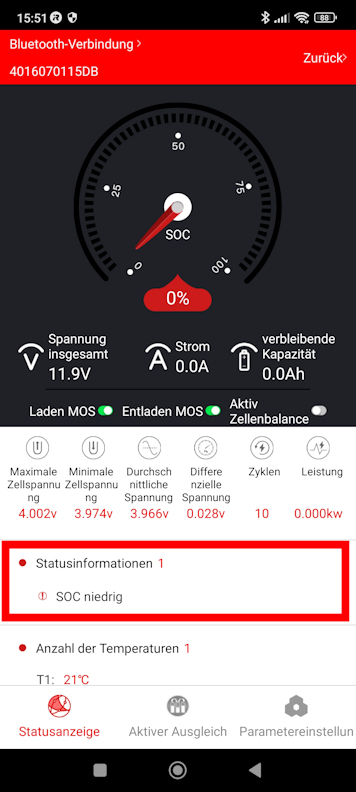 Mein BMS hat also nicht funktioniert, obwohl ich mit dem Bluetooth-Taster und der Überbrückung PIN 6/7, wie beschrieben, gearbeitet habe und die App funktioniert hat.