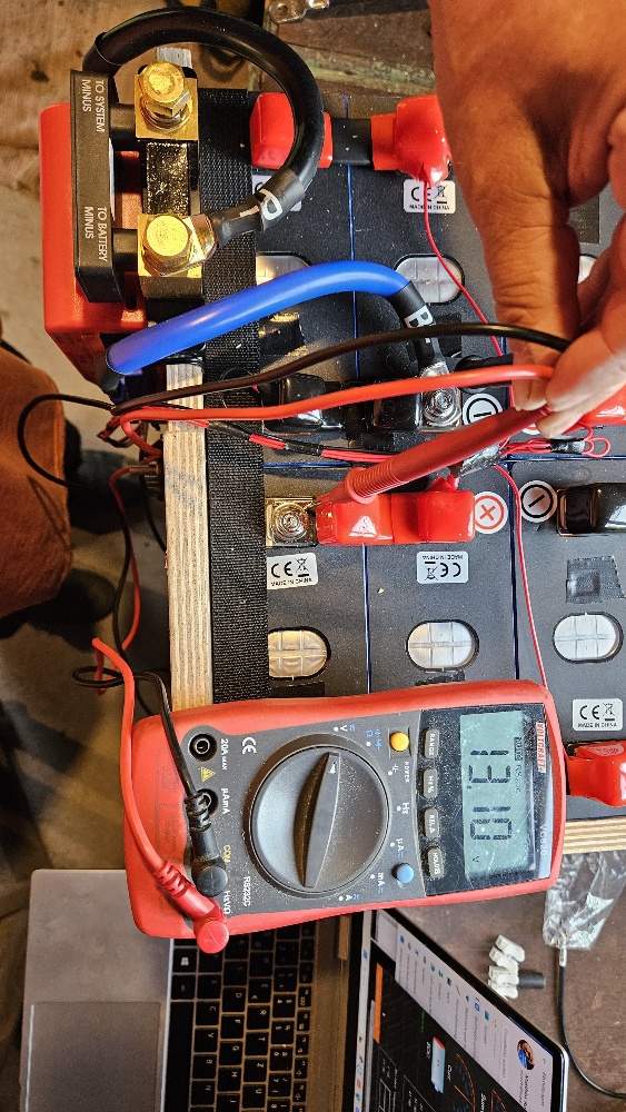 So, jetzt habe ich das 300 A BMS sorgfältig eingebaut, angeschlossen, das Balancer-Kabel paarmal geprüft auf richtige Spannungen und eingesteckt. Über das BMS messe ich jetzt richtige Batteriespannung und laden kann ich auch ;-).