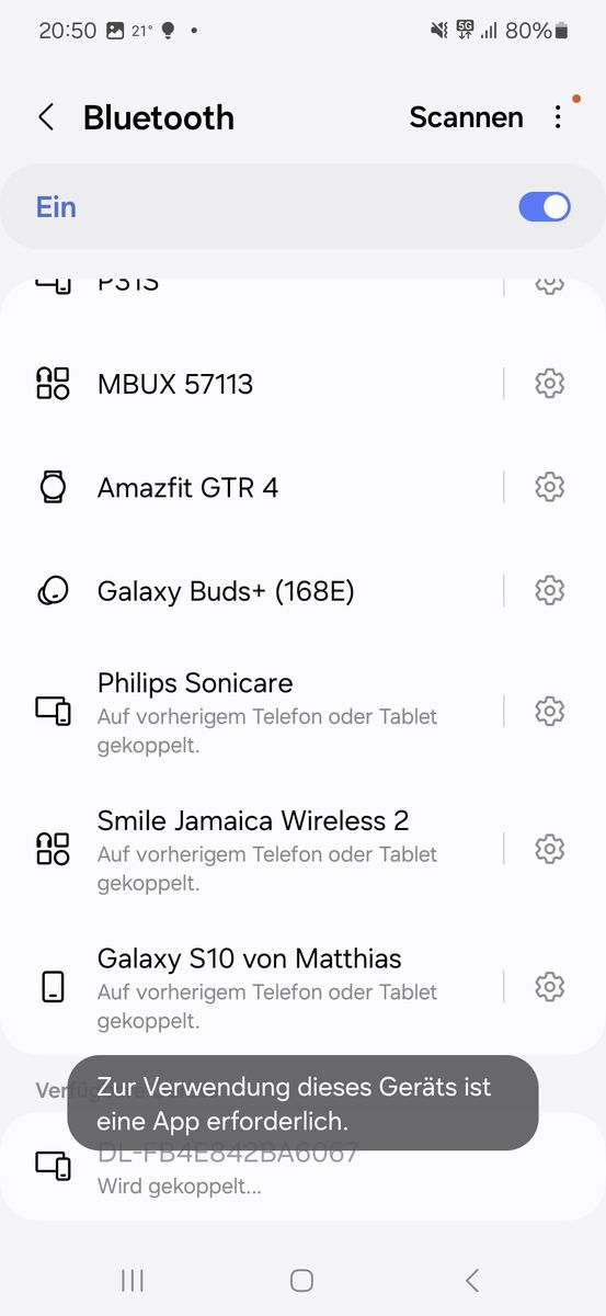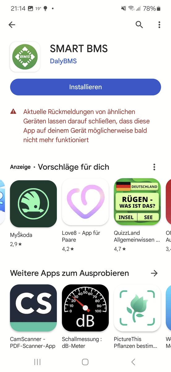 Allerdings funktioniert die Dali BMS App nicht. Habe sie auch nochmal installiert. Das Handy erkennt BT und zeigt die aufgedruckte Nummer BT-... an. Wenn ich Doppelklick drauf gebe will es verbinden und bricht nach einer Weile mit Fragezeichen ab. (dieses sagt, dass eine App dafür notwendig ist, sie ist aber installiert).