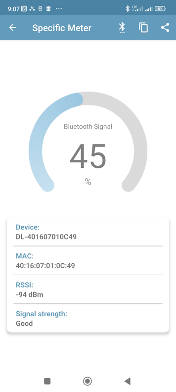 Hier das Signal eines Daly Bluetooth-Transceivers im Außenbereich im Abstand von 15m: Es wird ein Signalpegel von -94dBm gemessen. Das dürfte in etwa die Grenze der Reichweite sein, die praktisch nutzbar ist. Im Innenbereich kommt man aber kaum auf solche Reichweiten, weil durch Dämpfung und Reflektionen von Mauern und Störungen anderer Geräte, die im selben Frequenzbereich arbeiten, die Reichweite stark vermindert wird. Bis zu 5m soillten bei freier Sichtverbindung aber meistens möglich sein.