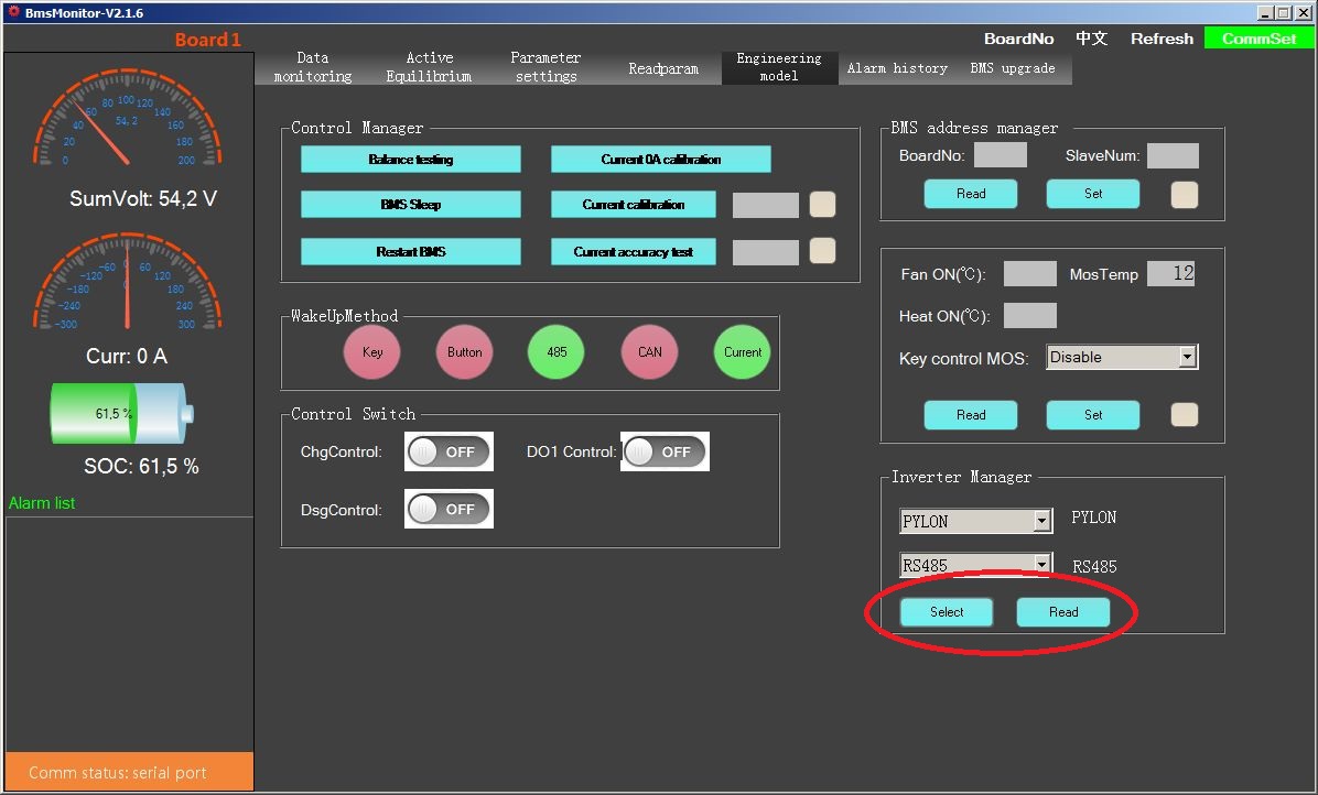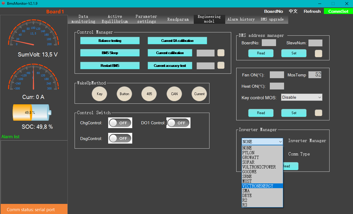 Ferner muss das BMS entsprechend eingestellt werden, damit es das richtige Protokoll "spricht". Das stellt man über die Windows-Software BmsMonitorV2.1.9.zip ein.