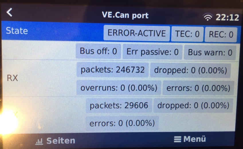 Status ist: Auf Rx und RX werden Pakete empfangen/gesendet, jedoch erkennt das Cerbo-GX die Batterie als solche nicht.