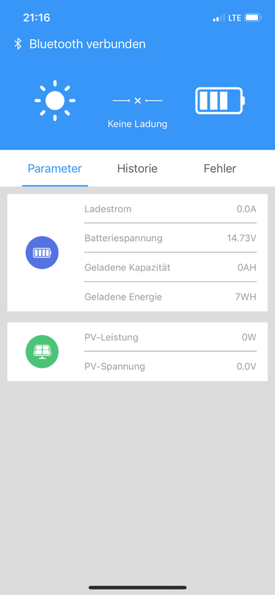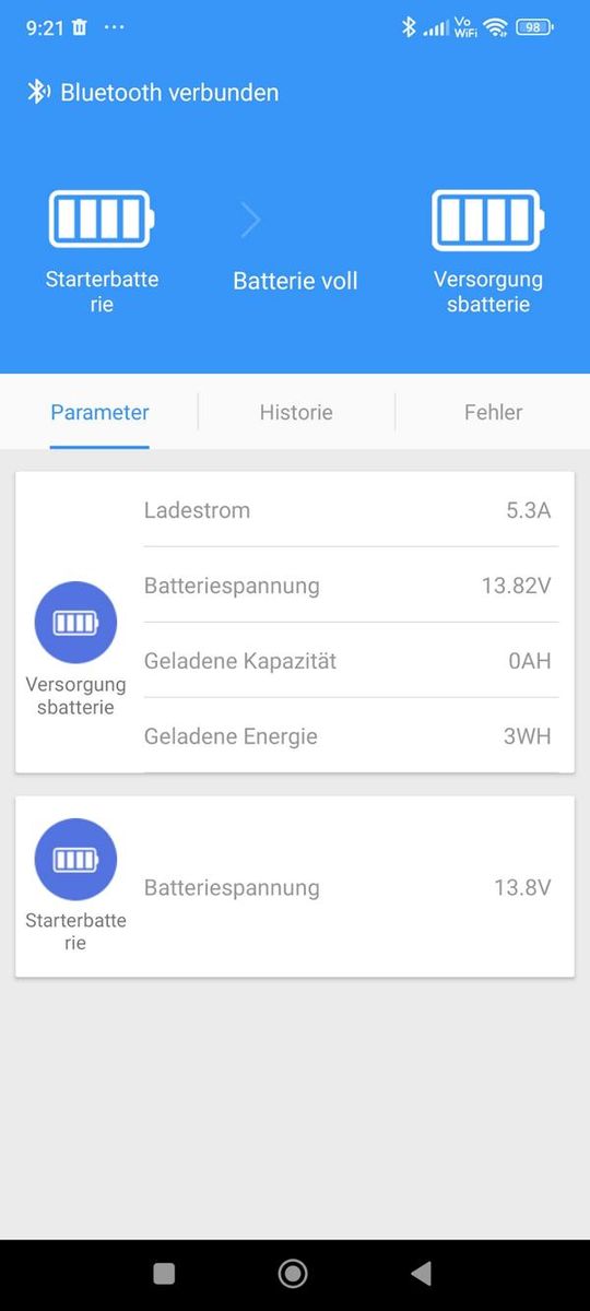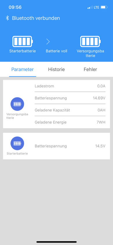 Leider sehe ich in der ChargerConnect App (Iphone 12) nur den Status der PV Einspeisung (ca. 38V) und Boardbatterie (ca. +/- 14V), die Starterbatterie fehlt jedoch obwohl Spannung am Starteranschluß (ca. 13,7V) anliegt?