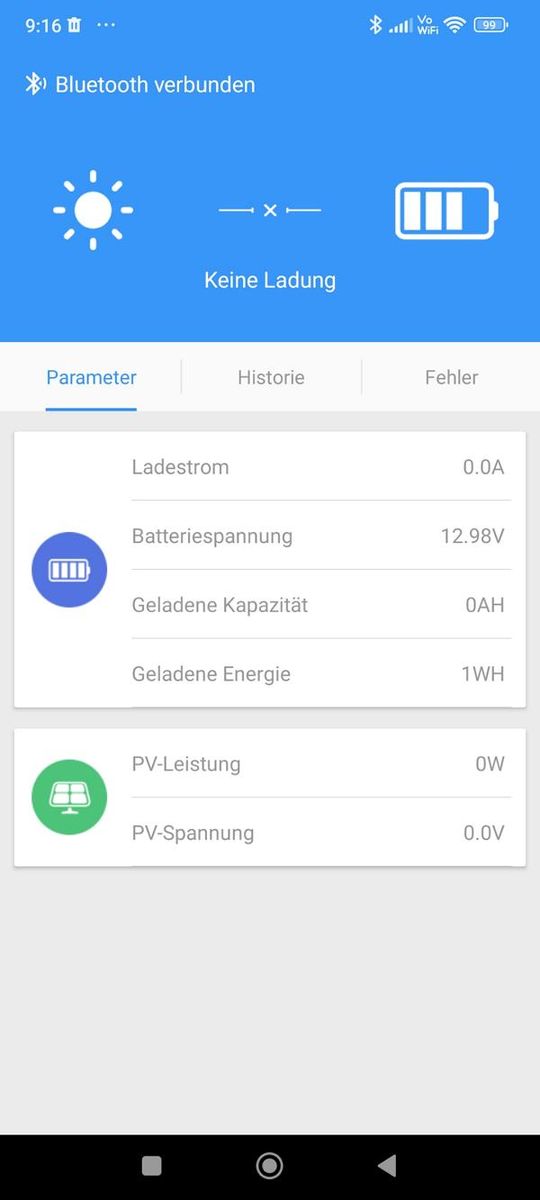Wenn keine Solarleistung und keine Ladung über die Fahrzeug-Lichtmaschine vorliegt, sieht die App so aus: