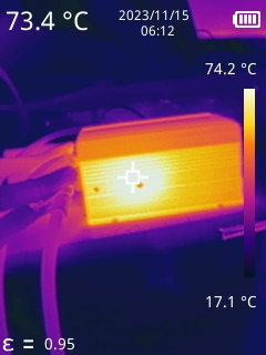 Bild 1: Bei 74°C an der Seite des kleinen 500W-Wechselrichters hört man die Ehefrau im Wagen jauchzen, jedenfalls wenn sie dranfasst...