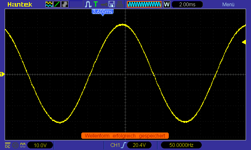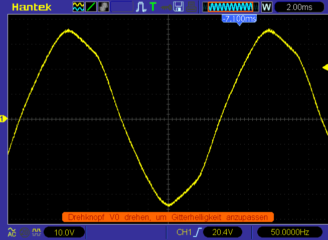 OK: So ein bisschen schief ist der Steckdosenstrom heutzutage schon, wegen der vielen elektronischen Geräte mit Schaltnetzteilen und hohen Blindleistungsanteilen im Netz. Mit so einem Sinus aus der Steckdose funktionieren aber alle 230V-Geräte einwandfrei.