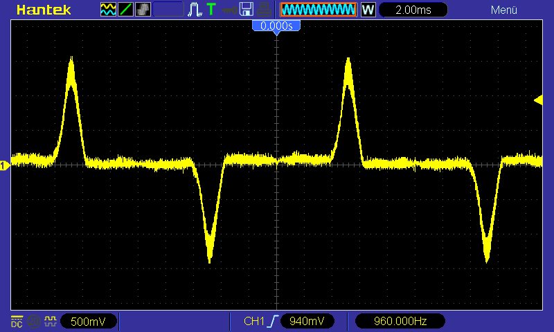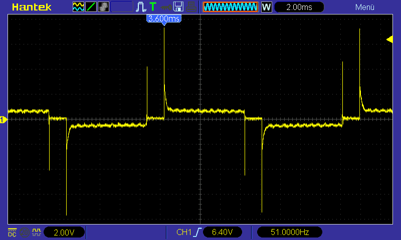 Und genauso sieht das dann auch auf dem Oszillogramm des fließenden Stroms aus: