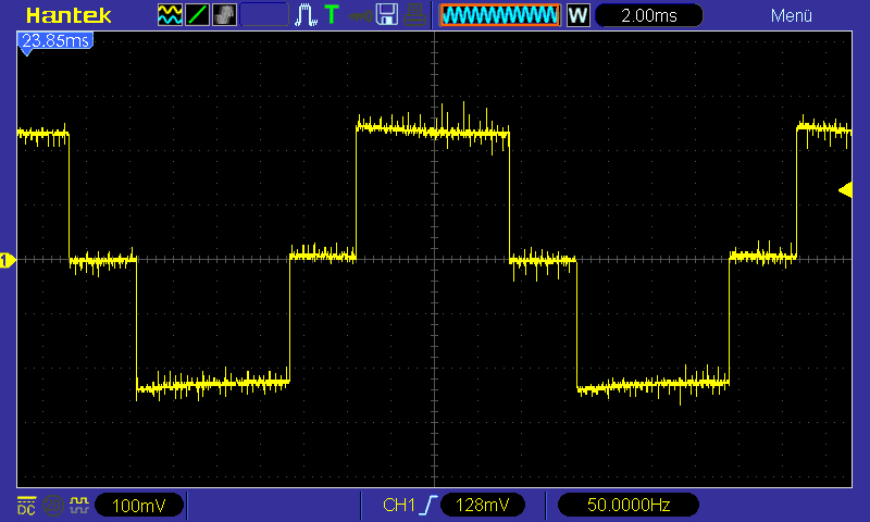 Bild 3: Stromverlauf einer ohmschen Last (hier: Fön) an einem Trapez-Wechselrichter. (Das Gekrisel sind Impulse durch den im Fön enthaltenen Elektromotor des Gebläses.)