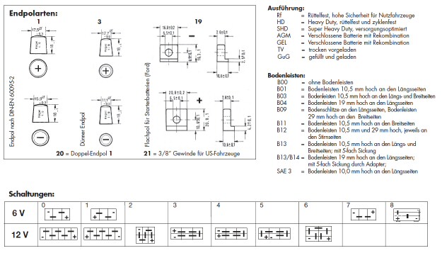 Starterbatterien Angaben wie Kälteprüfstrom z. B. 360, Polanordnung 0, Endpolart