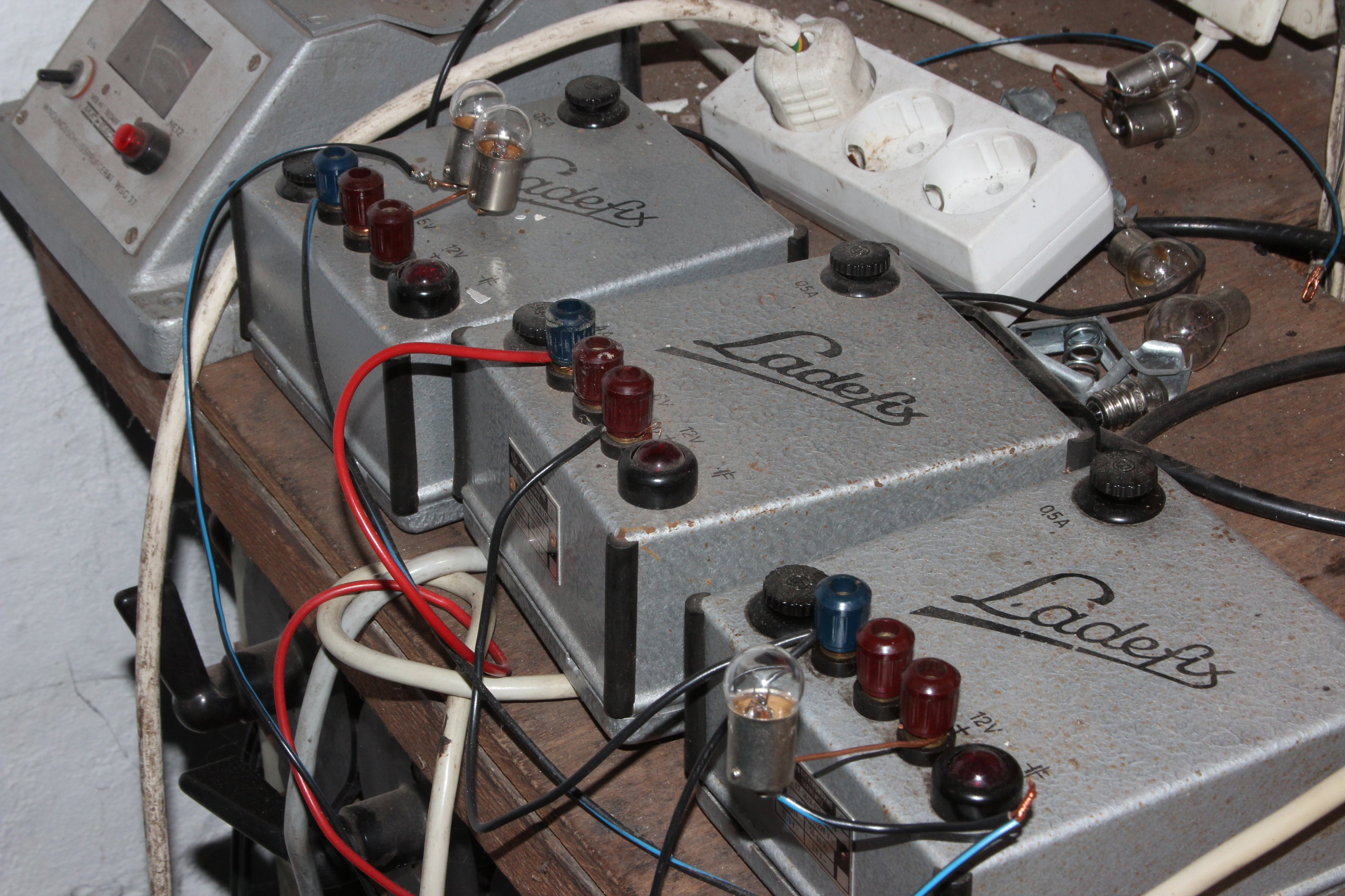 Diese robusten Ladegeräte aus den 1960-ern habe ich mehrfach bei Kleinanzeigen gekauft. Hier laufen sie im Testbetrieb zur Stützung meiner Werkstattbatterien (auch Notlicht Haus) 6/12/24 V. Einspeisung über Trafo um die 180 V und auch mit Glühbirne sekundär reduziert. Die Batteriespannungen liegen bei ca. 6,5 V/13,2/13,2 V. Da in der dunklen Zeit unser Flurnotlicht viel leuchtet, muß ich die 12 V-Batterie aber höher einstellen. (Unser 230 V-Flurlicht ist sehr hell, damit Frau bei Reinigung Schmutz sehen, so nutzen wir für das normale Begängnis das etwas schwächere Notlicht).