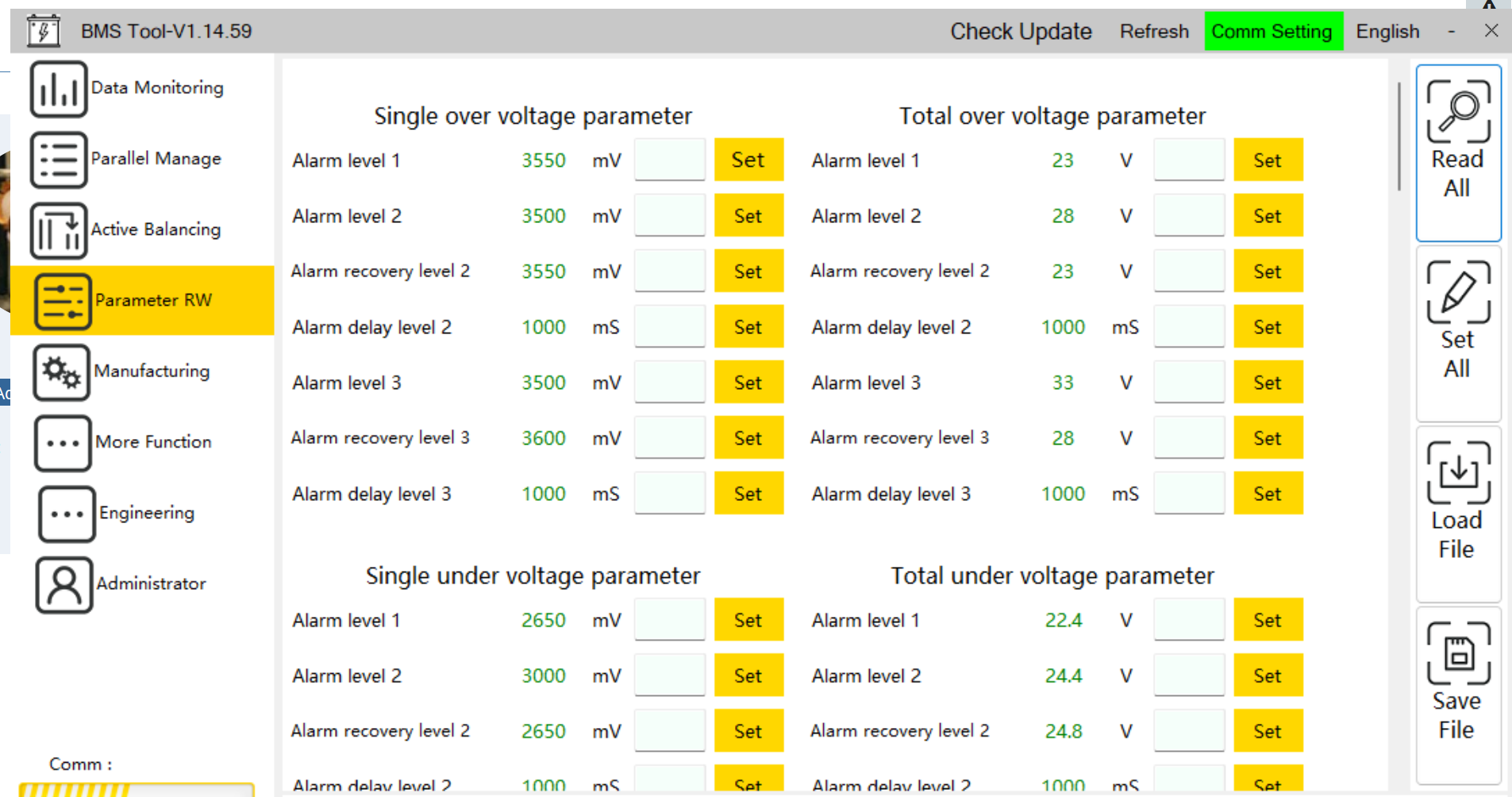 Da ich die volle Kapa das Akkus nicht brauche, habe ich die Schutzparameter auf MaxZelle=3,5V; MinZelle=3,0V; GesamtVmax=28,0V GesamtVmin=24,4V eingestellt.