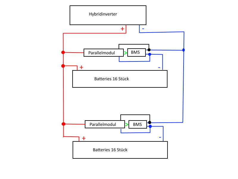 Im Anhang ist das geplante Schaltbild der Komponenten. Der grüne Pfeil ist die Datenleitung zwischen BMS und Parallel Modul.