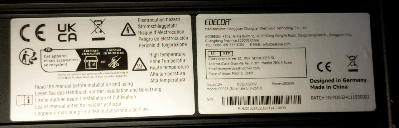 Ich hab hier gerade einen 12V/2,5kW EDECOA Wechselrichter mit Netzvorrangschaltung und integriertem Ladegerät von einem Kunden zurückbekommen und hier vor mir stehen und da befinden sich gleich mehrere Symbole auf den Aufklebern, natürlich auch CE-Zeichen.