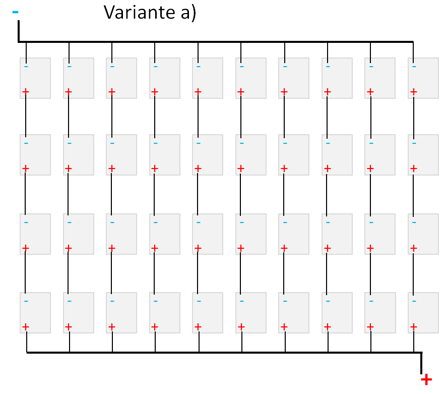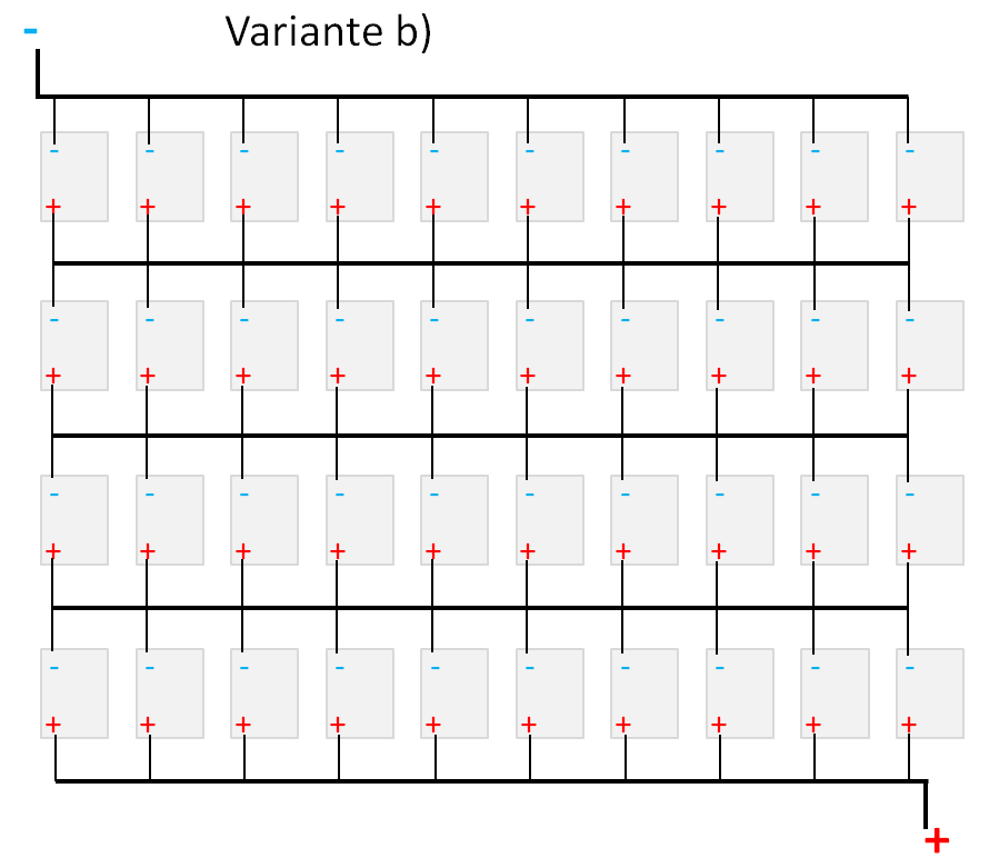 b) erst 10 Akkus parallel klemmen und dann 4mal die 10er-Gruppen in Reihe?