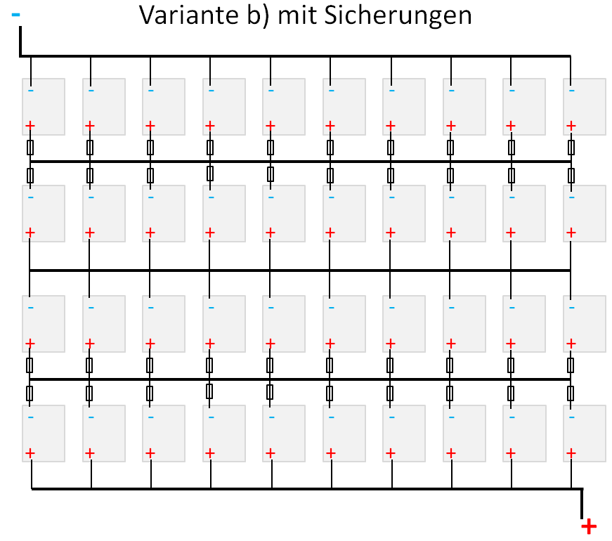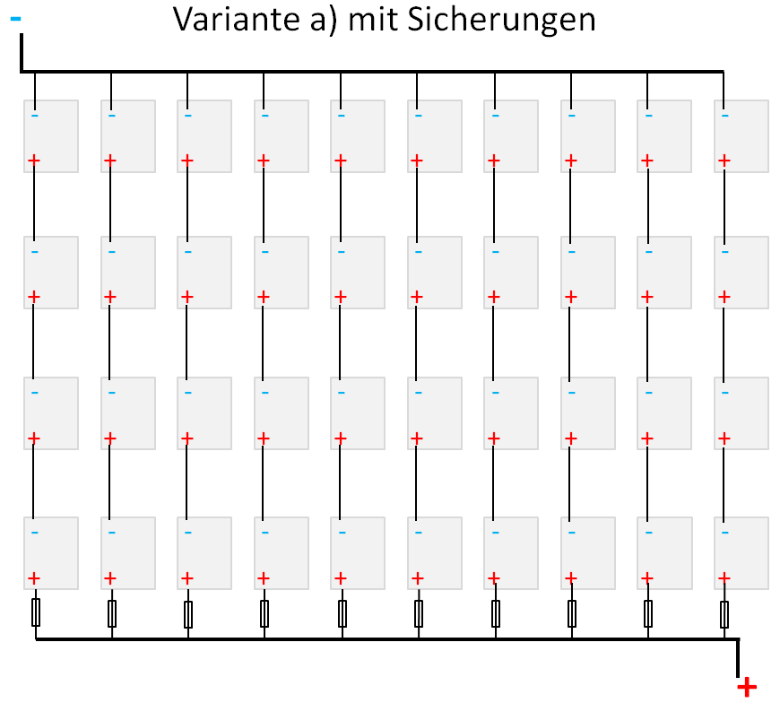 Ich wollte für Variante b) jeden Akku einzeln absichern - macht 40 Sicherungen. Frage ist, ob die bei einem Zellenschluss überhaupt auslösen würden... Ich dachte an 40A-Sicherungen, die sollen ja nicht gleich fliegen, wenn der Wechselrichter (3kW konstant, 6kW Spitze) mal ordentlich zieht.