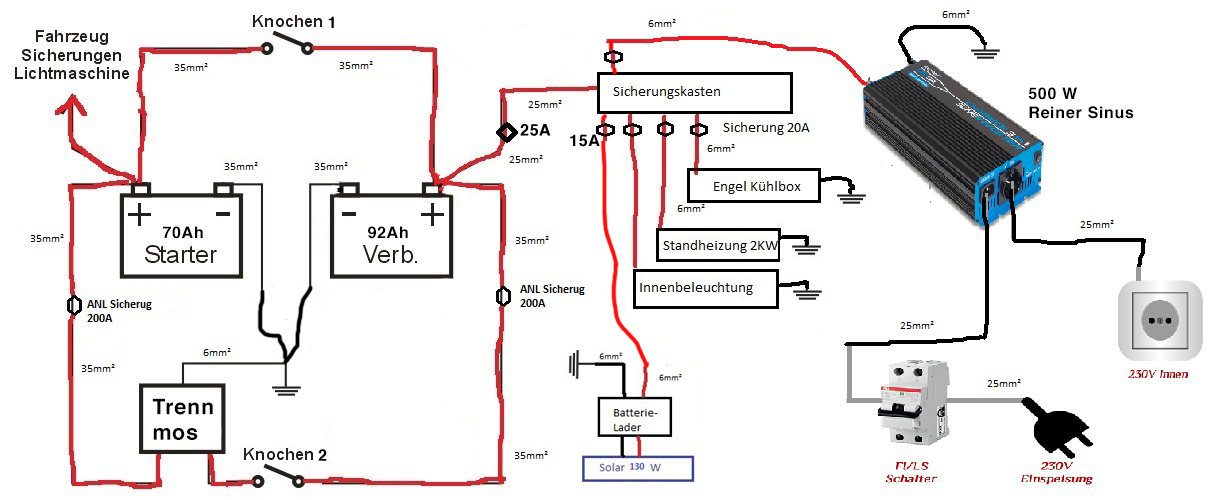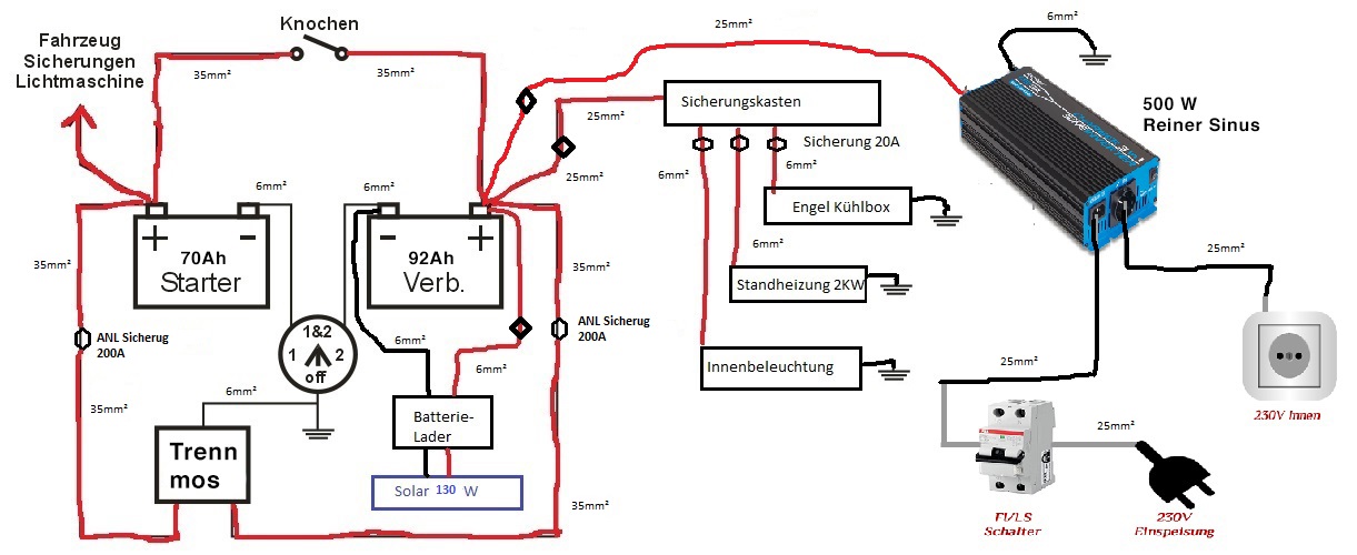 3. Welche Kabelquerschnitte sind geeignet? Ich habe jetzt zwischen den Batterien untereinander sowie zum Sicherungskasten 10mm2. Der Rest also ab dem Sicherungskasten zu den Verbrauchtern, Batterie zum Batterielader 6 mm2. Passt das?