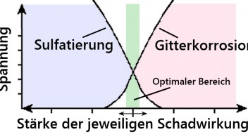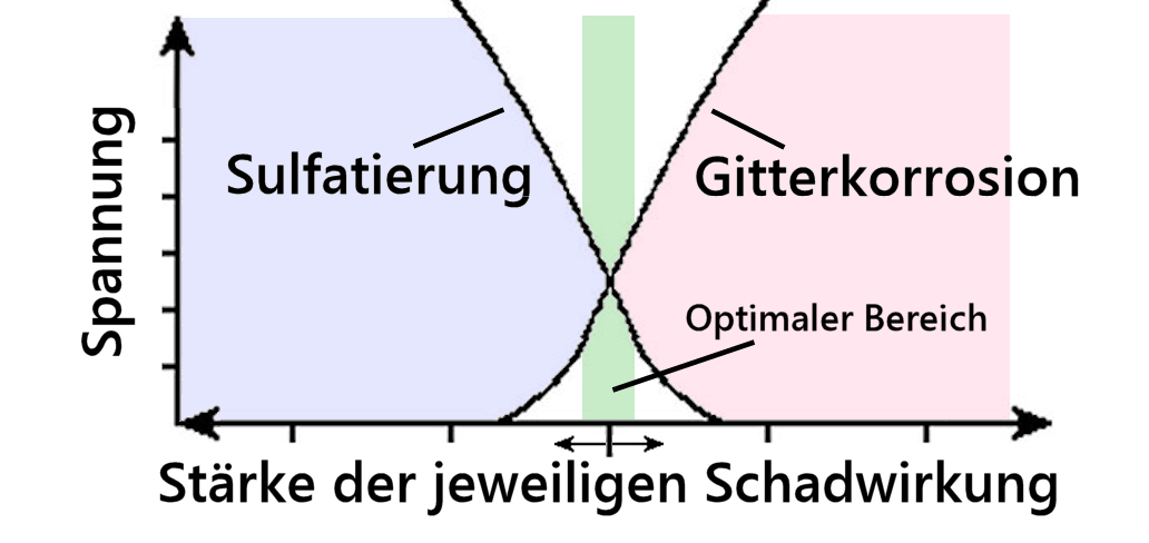 Wichtig ist, dass man den Zusammenhang zwischen Sulfatierung einerseits und Gitterkorrosion andererseits versteht: Man könnte mit der Spannung natürlich noch tiefer gehen, um Korrosion immer weiter zu vermindern, nur beginnt eben irgendwann wieder der Sulfatierungsbereich, wenn Bereiche der positiven Platten nicht mehr dauerhaft voll geladen bleiben.