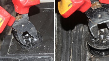 Die beiden Schenkel eines Seitenschneiders werden in jeweils eine Hand genommen, mit dem Oberkörpergewicht über die Zange gebeugt und die Spitzen in die Verschraubung gedrückt. Den Oberkörper samt Seitenschneider drehen und die Schrauben lassen sich lösen. Man muß etwas üben.