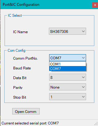 Vorausgesetzt Sie haben den USB-Stecker des Daly-Adapterkabels (dabei handelt es sich um eine Schnittstelle serieller Port auf USB) an den PC angeschlossen, sollten Sie jetzt dessen COM-Port auswählen können (die COM-Port-Nummer wird bei anderen PCs vermutlich anders sein als bei mir, im Zweifelsfall ausprobieren). An der Einstellung darunter (Baud Rate/Data Bit/Parity/Stop Bit) bitte nichts verändern!