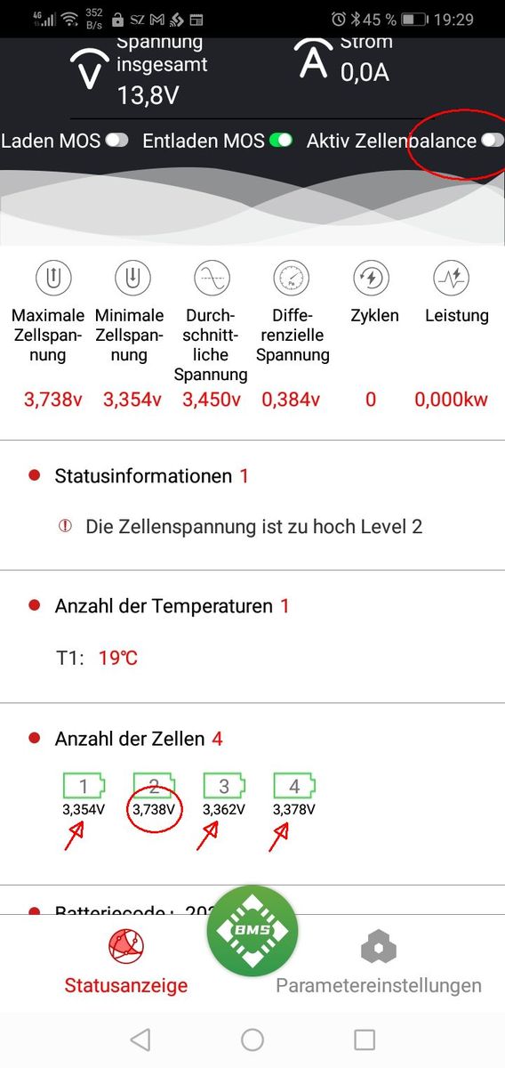 Dabei stoße ich auf das Problem, dass eine der Zellen > 3,7 V Spannung aufbaut, während ich bei den anderen drei Zellen < 3,5 Volt Spannung sehe (siehe Screenshot). Die Spannungen kann ich auch mit dem Voltmeter verifizieren. Das Daly BMS unterbricht daraufhin den Ladevorgang, logisch, denn die Zellspanungsschutzabschaltung habe ich bei 3,7 Volt eingestellt. Eine Ausbalancierung der Zellen findet offensichtlich nicht statt. Was kann ich tun?