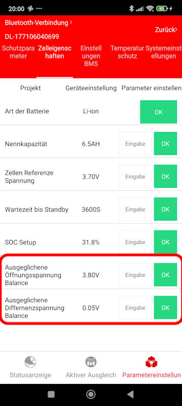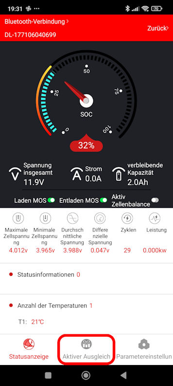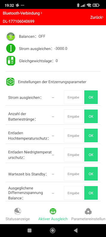 Wenn man mit der Smatfon App den Bluetooth-Transceiver des Daly Active Balancers verbindet, funktioniert natürlich nur noch dieses eine ausschließlich für ihn gedachte "Aktiver Ausgleich"-Konfigurations-Menue, aber der gesamte Rest der App nicht. Weil dann ja auch kein BMS verbunden ist. Jedenfalls ist es nicht nicht über den Bluetooth-Transceiver des Daly Active Balancers erreichbar.