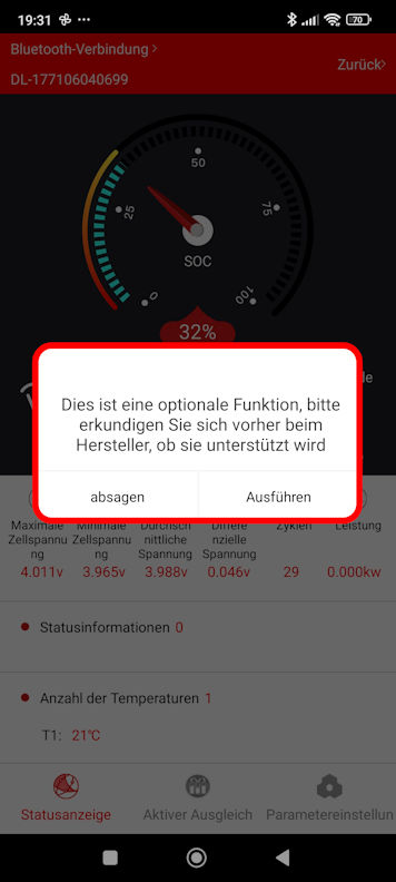 Bild 1: Dieses Menü ist ausschließlich dann funktionsfähig, wenn die App nicht mit einem BMS verbunden ist, sondern mit einem externen Equalizer (auch "Daly Active Balancer" genannt) verbunden ist. Ist die App mit einem BMS verbunden, ist diese Funktion ohne Funktion. Den passiven Balancer im BMS kann man damit nicht konfigurieren oder steuern. Drum steht da im Button auch "Aktiver Ausgleich", was ein Hinweis auf einen "Daly Active Balancer" sein soll und nicht auf den BMS-internen passiven Balancer.