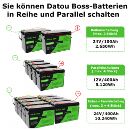 Reihen- und Parallelschaltbar bis max. 4 x 4 Stück (4S4P, 51,2V/400Ah)